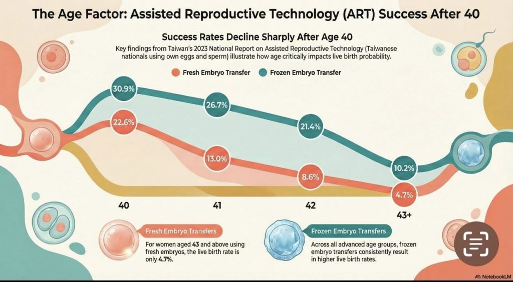 報告數據明確顯示,ART 成功率與年齡呈強烈的負相關。以臺灣籍婦女使用非捐贈配子的數據為例: