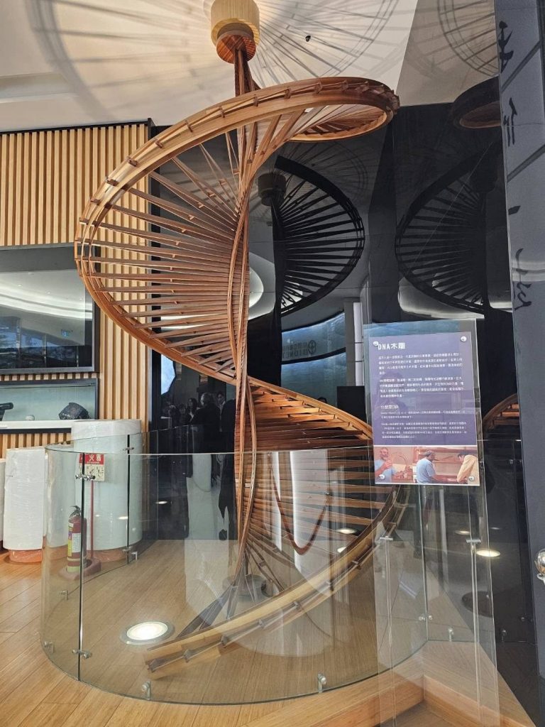 木製雙股螺旋(DNA)樓梯不僅是精美的背景,更是象徵生命科學核心的強大語彙。