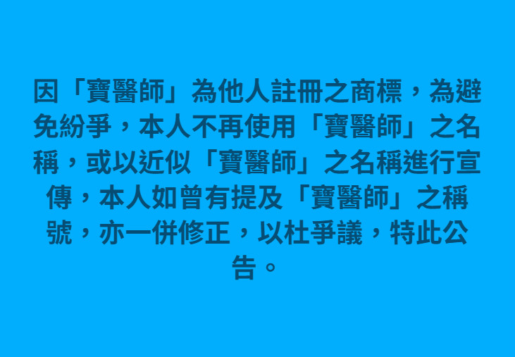本人不再使用「寶醫師」如曾有提及「寶醫師」之稱號,亦一併修正,以杜爭議,特此公告。